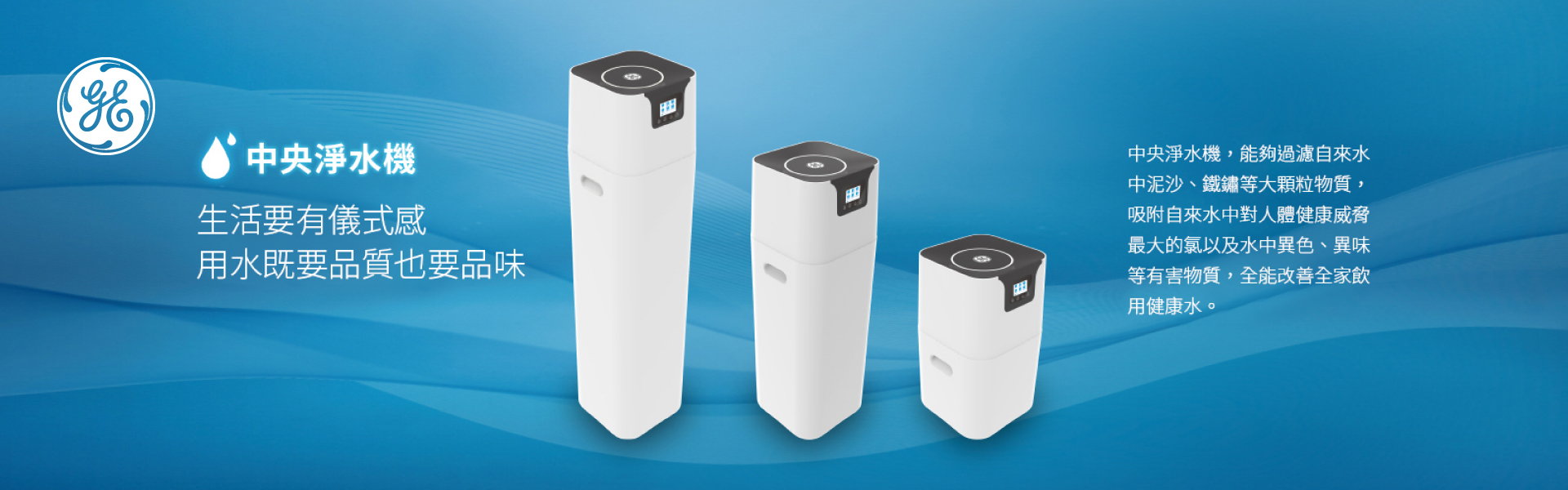 GTEF-30A01-TW NT$ 118,000 GTEF-15A01-TW NT$ 88,000 中央淨水器,能夠過濾自來水中泥沙、鐵鏽等大顆粒物質;吸附自來水中對人體健康威脅最大的氯,以及水中的異色、異味等有害物質,全面改善全戶飲水及用水安全。